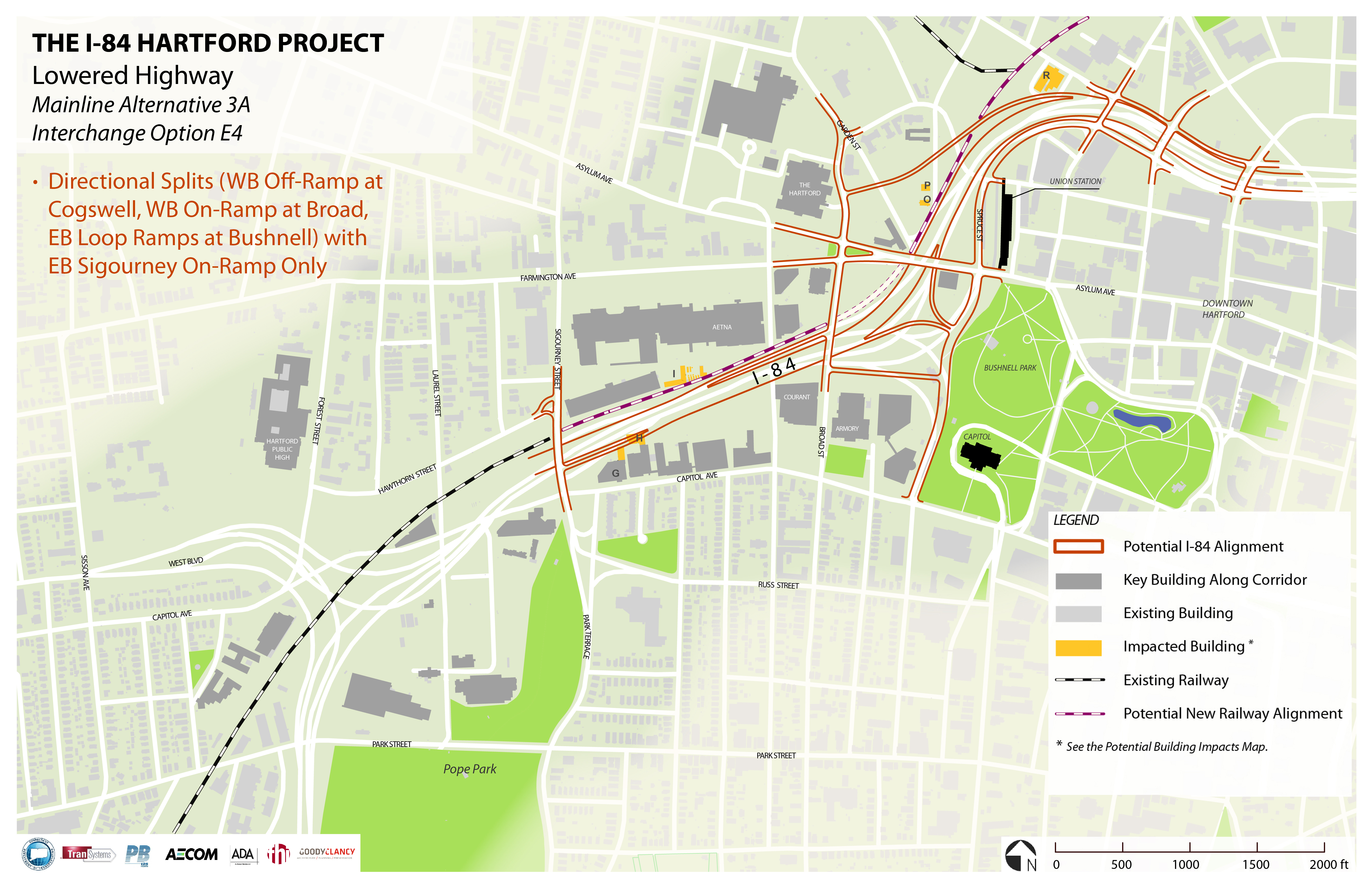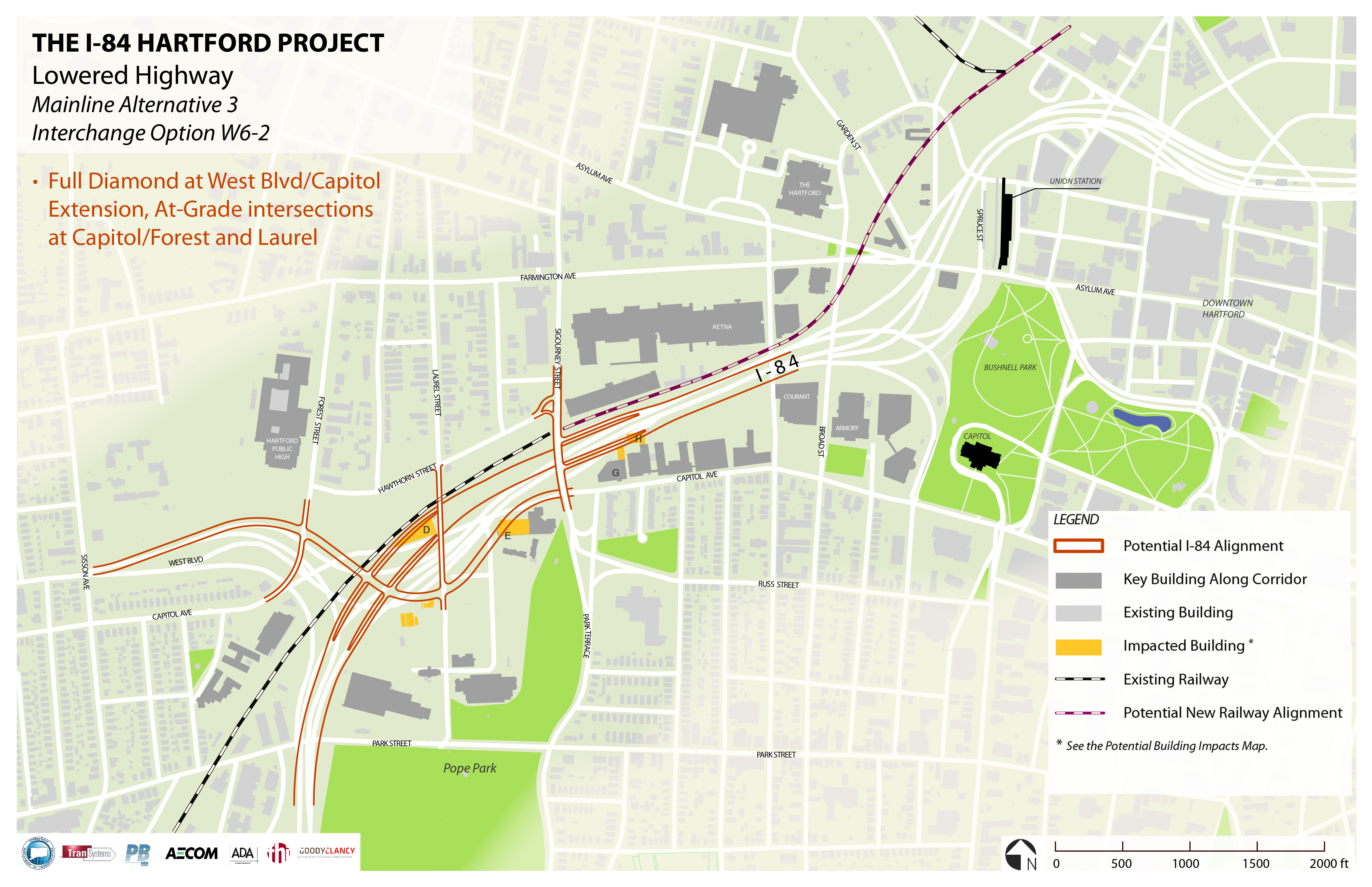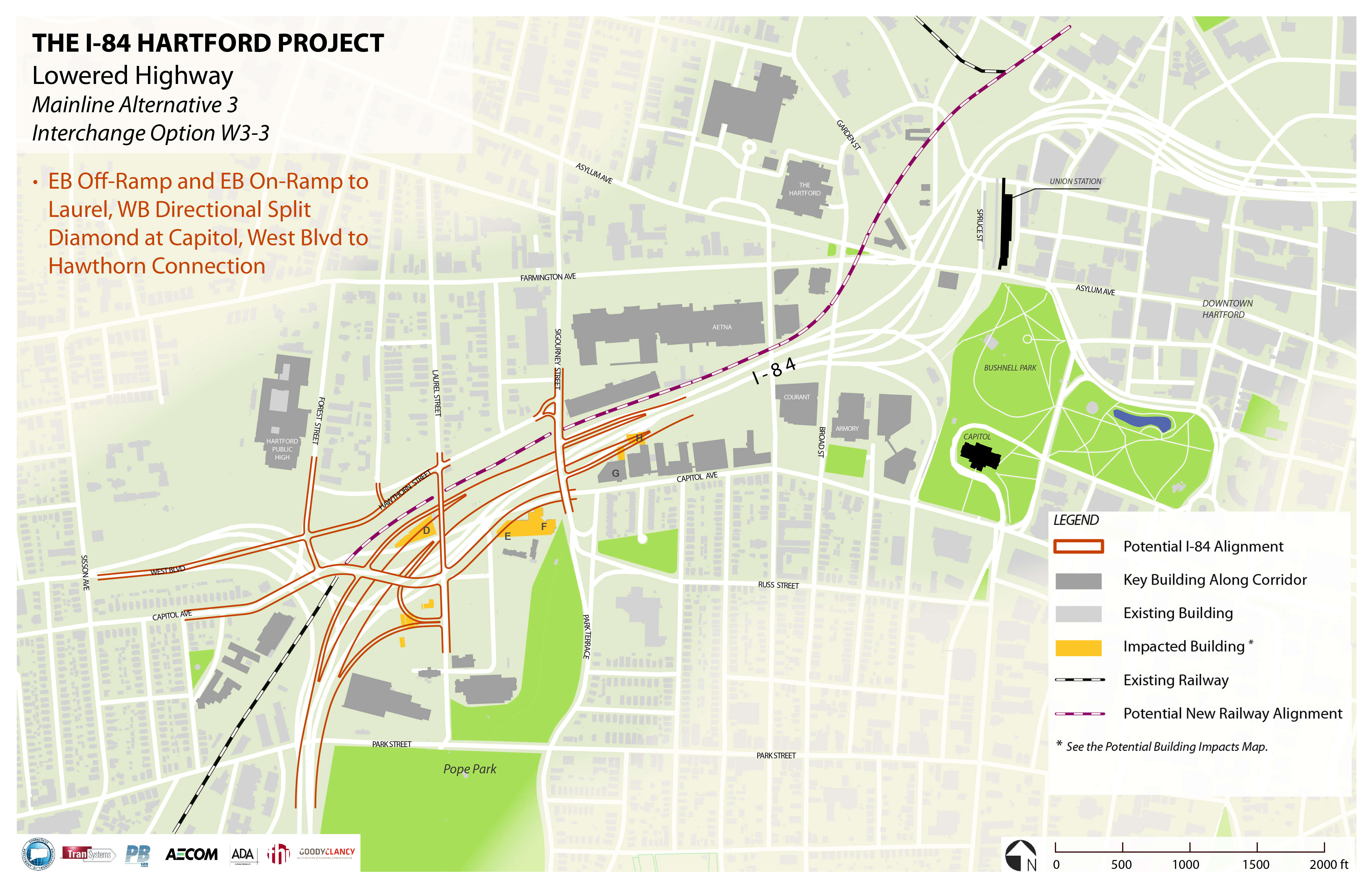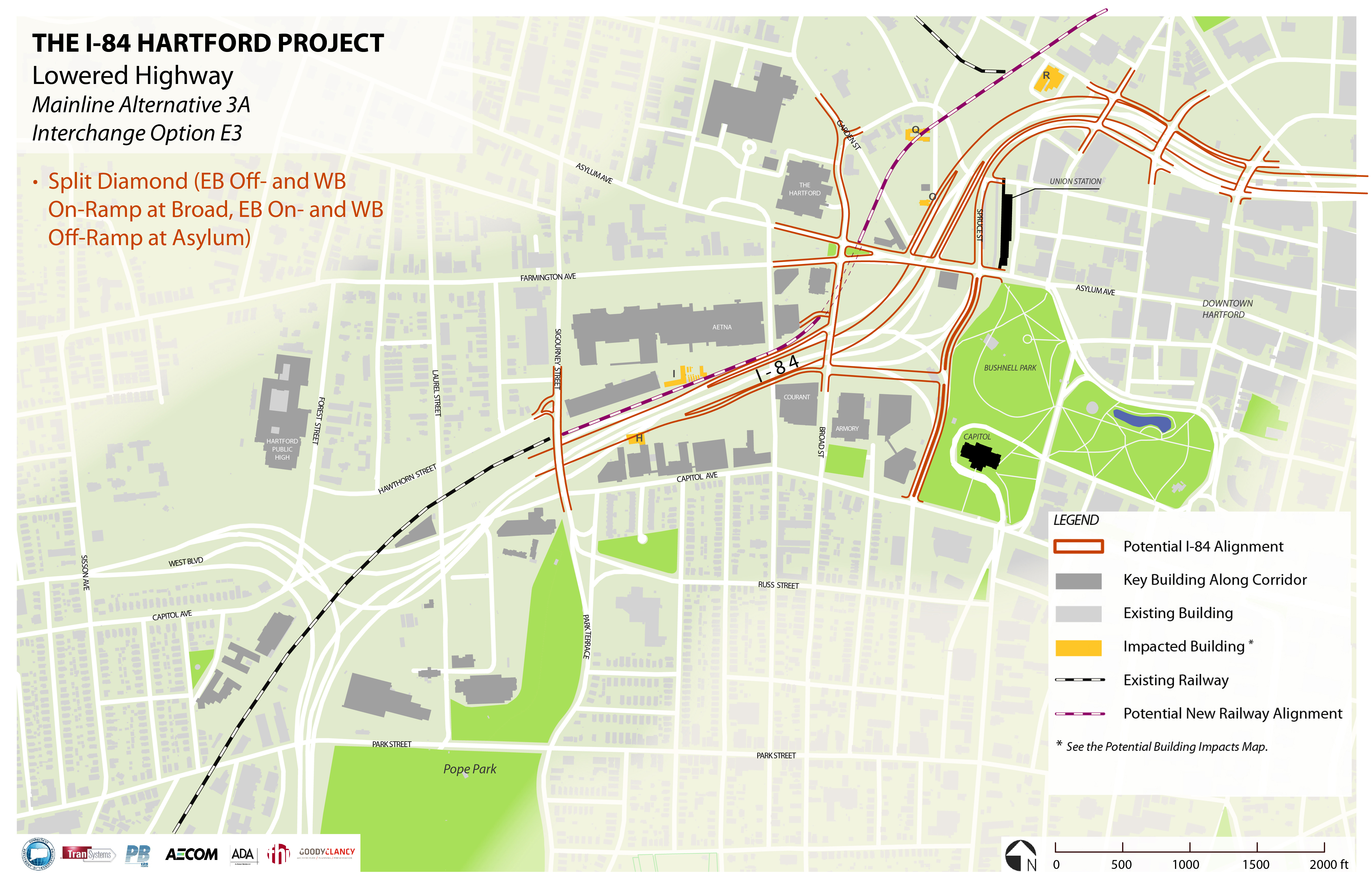 This interchange option routes eastbound on- and off-ramps to a new road connecting Asylum Street and Capitol Avenue, and westbound on- and off-ramps to Edwards Street. The Sigourney Street eastbound on-ramp and westbound off-ramp are rebuilt.