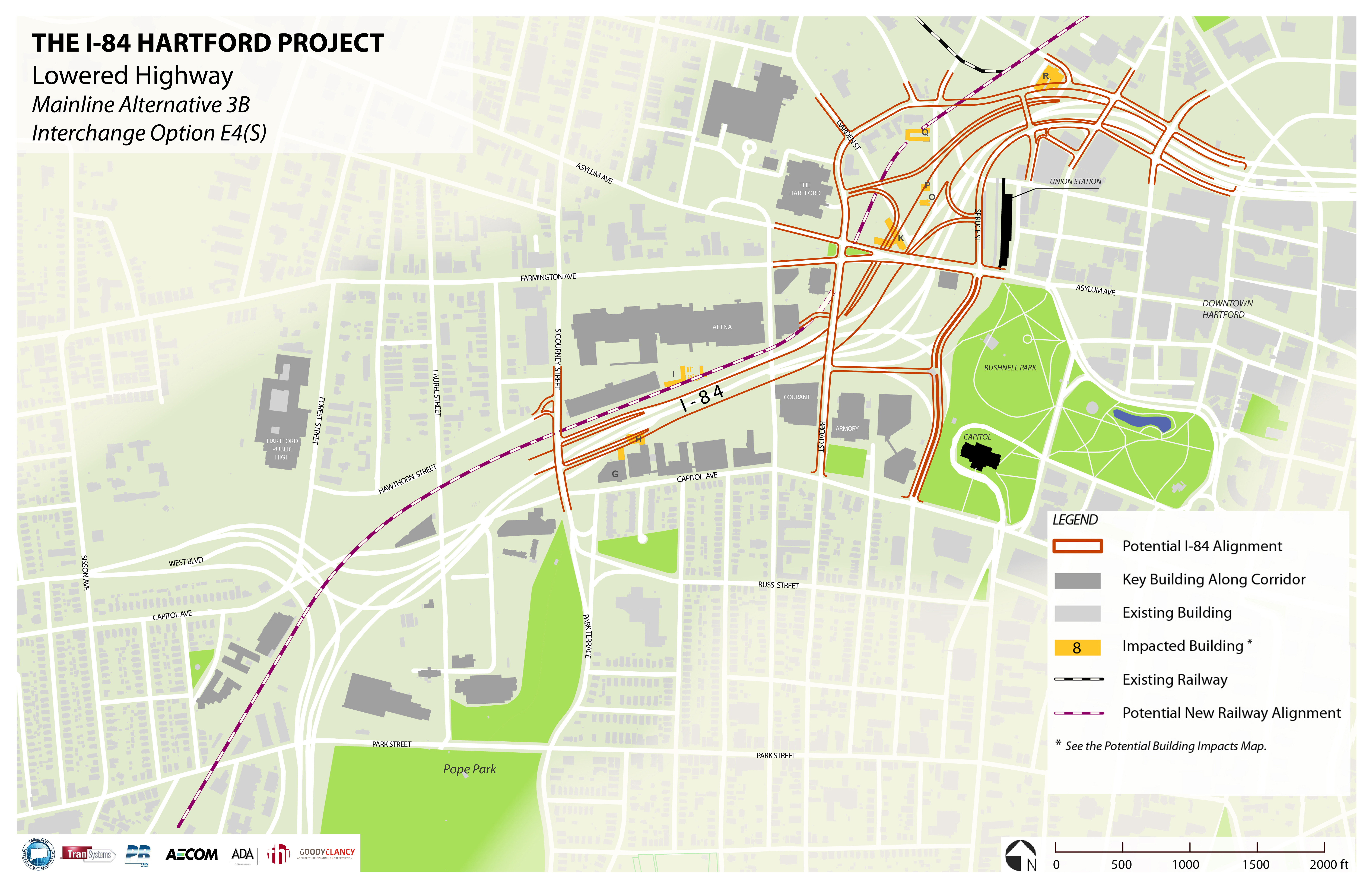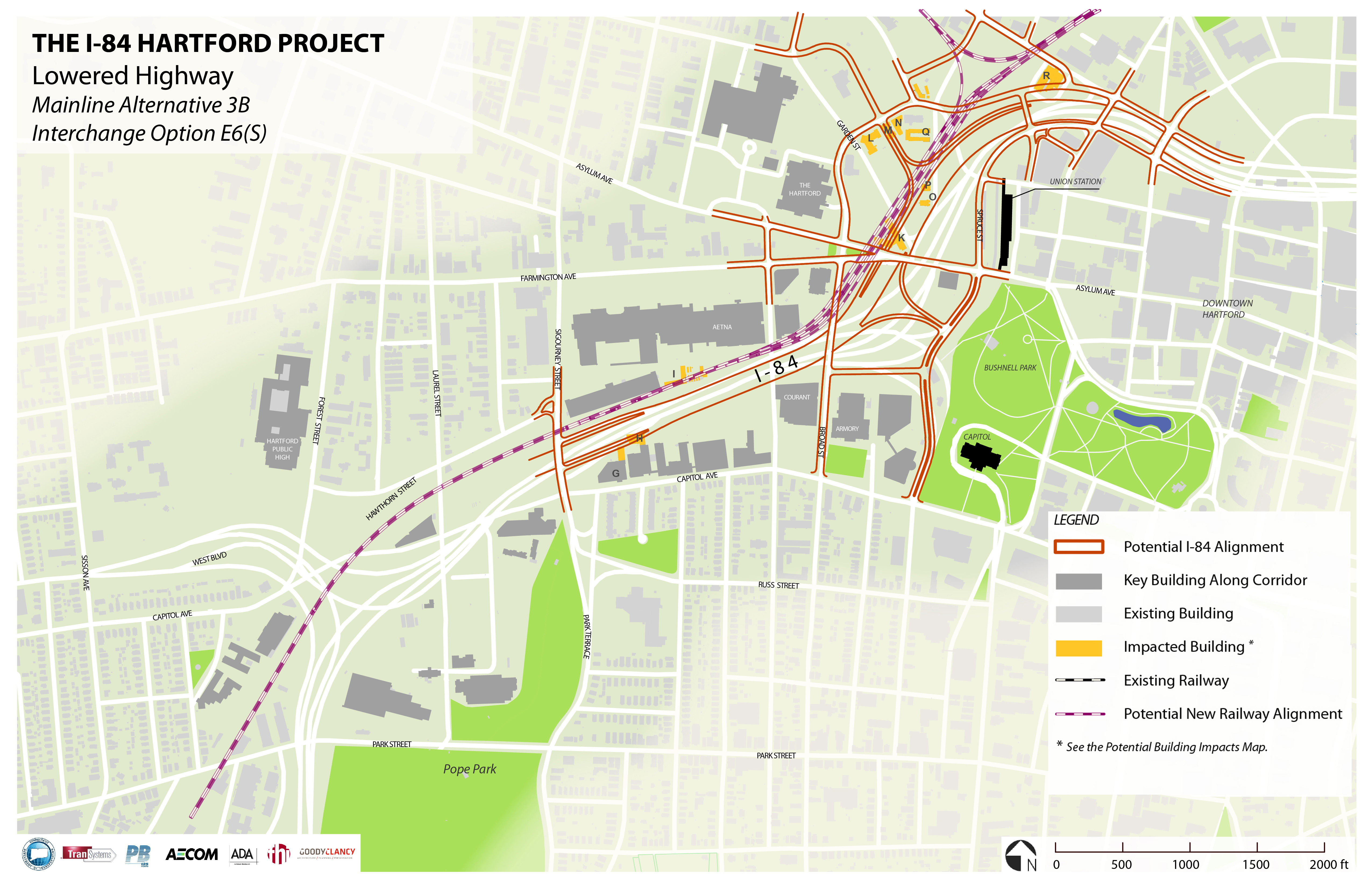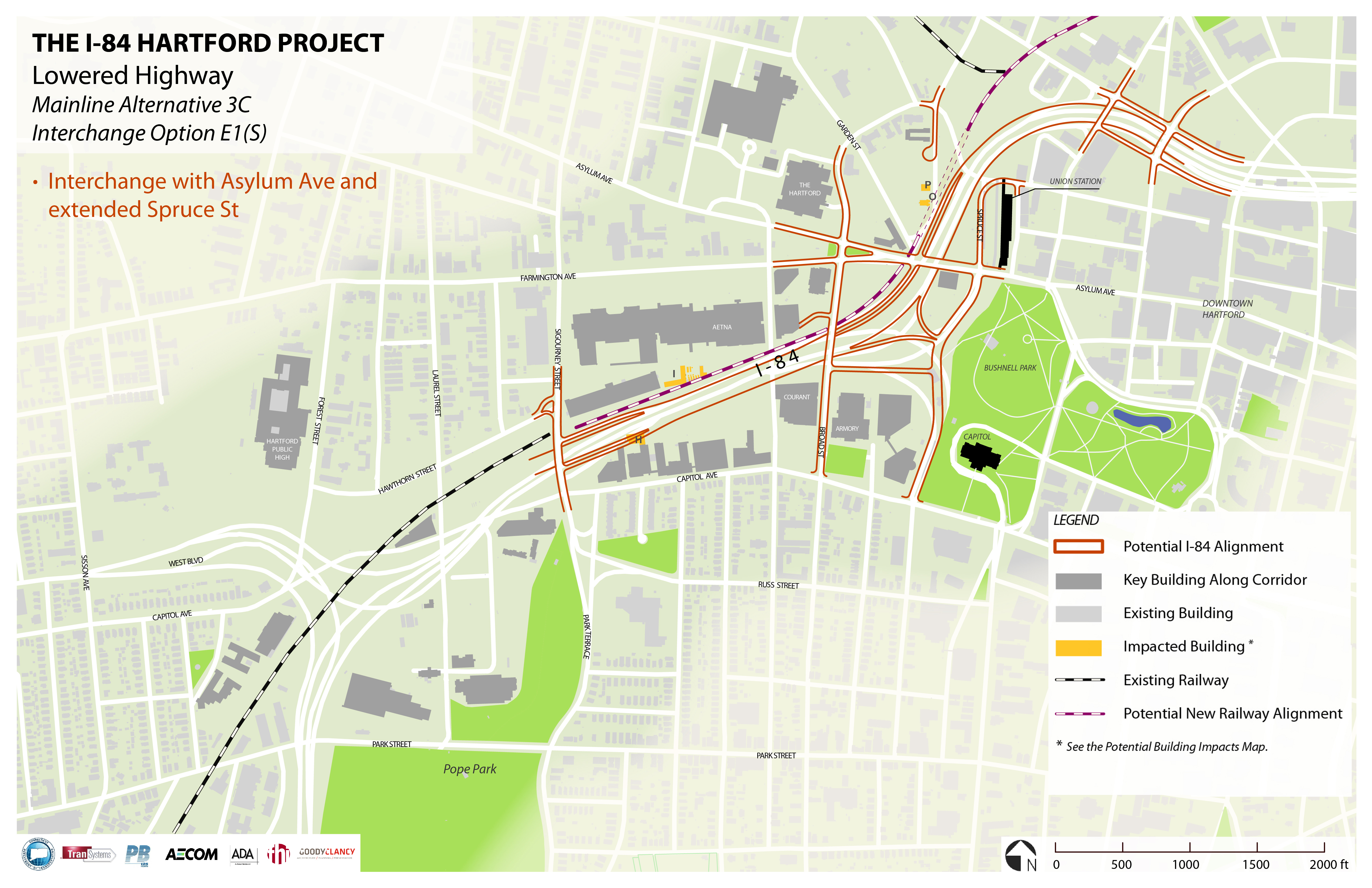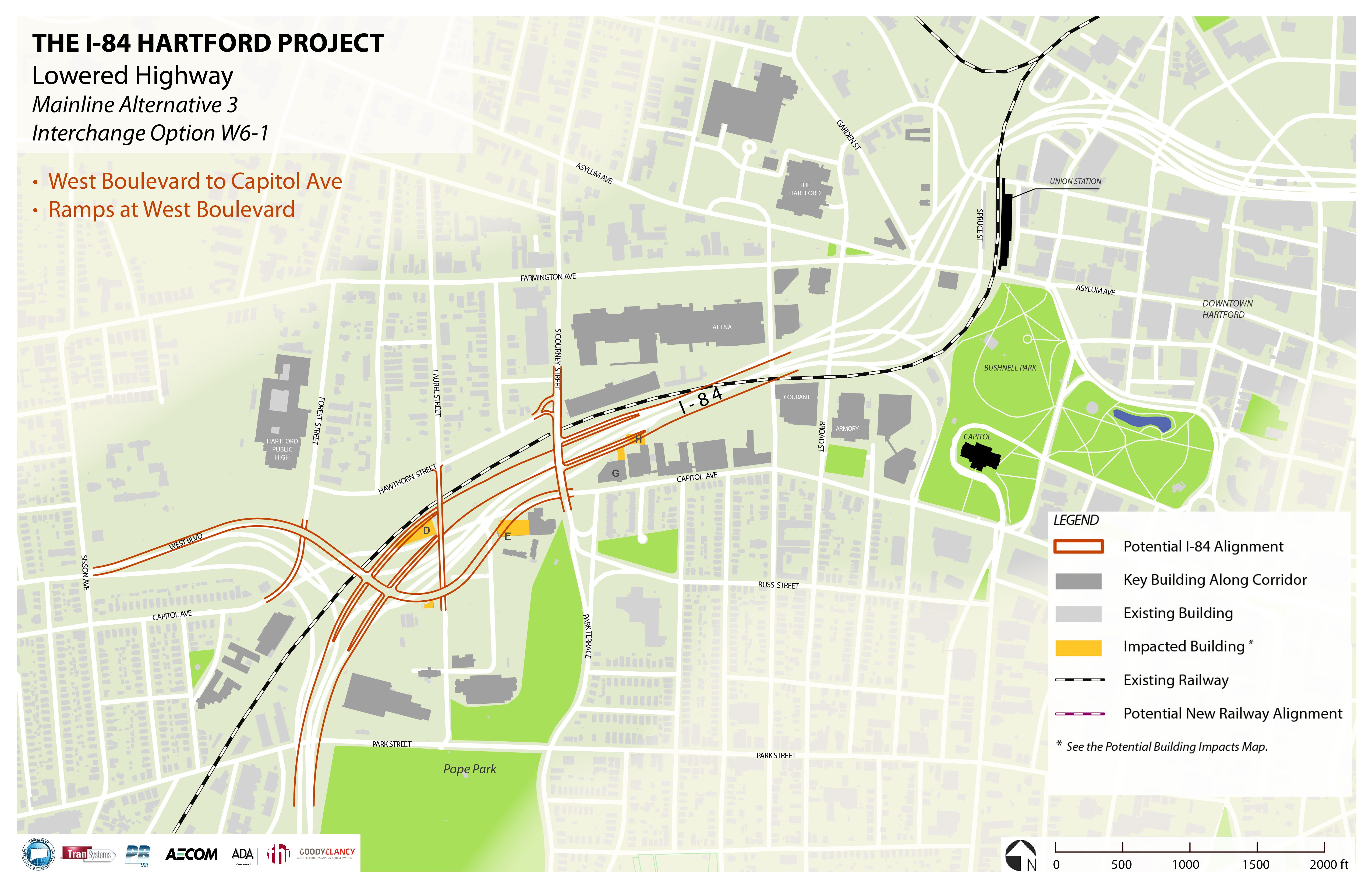 This interchange option routes eastbound on- and off-ramps to a new road connecting Asylum Street and Capitol Avenue, and westbound on- and off-ramps to Edwards Street. The Sigourney Street eastbound on-ramp and westbound off-ramp are rebuilt.