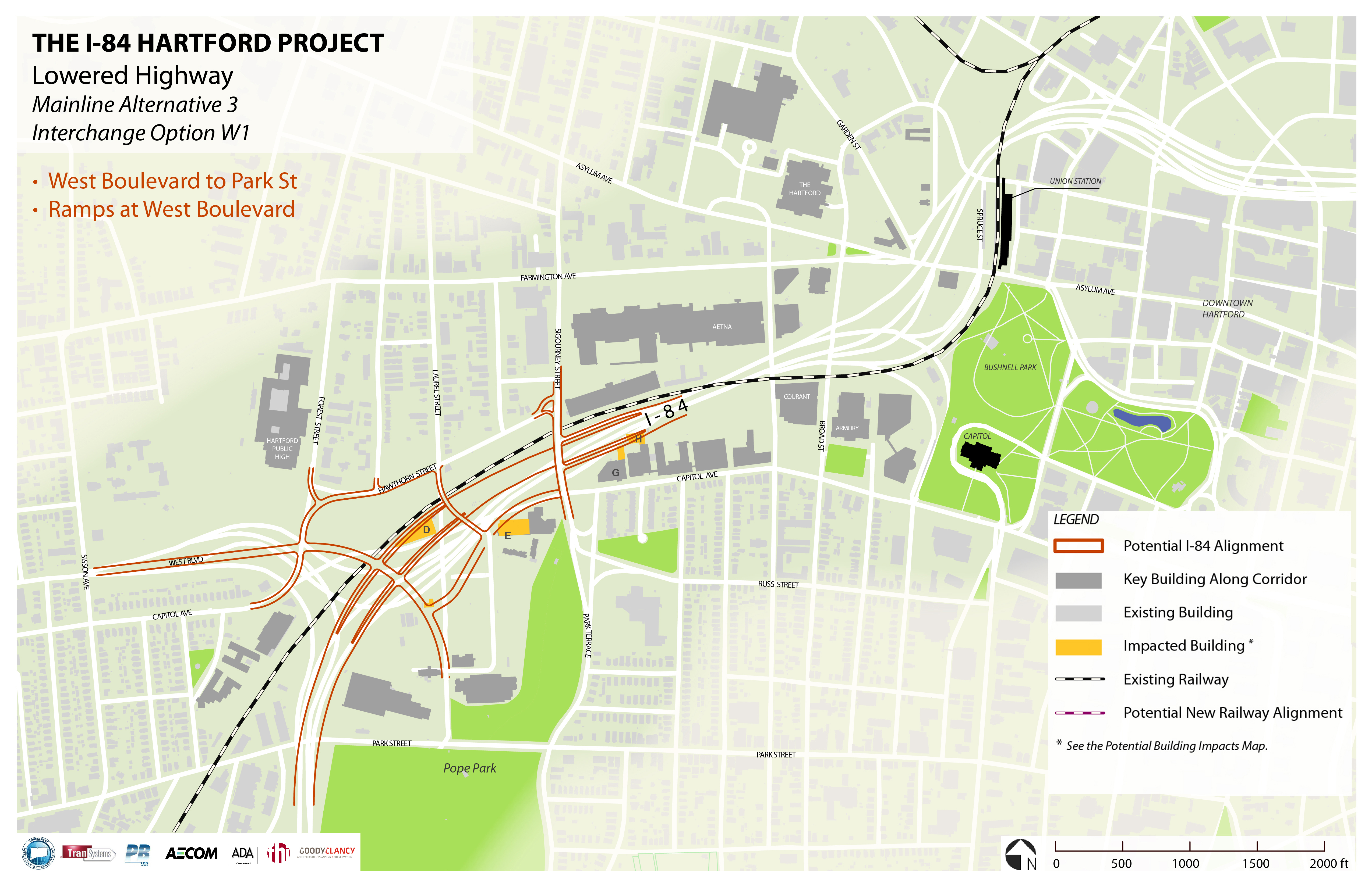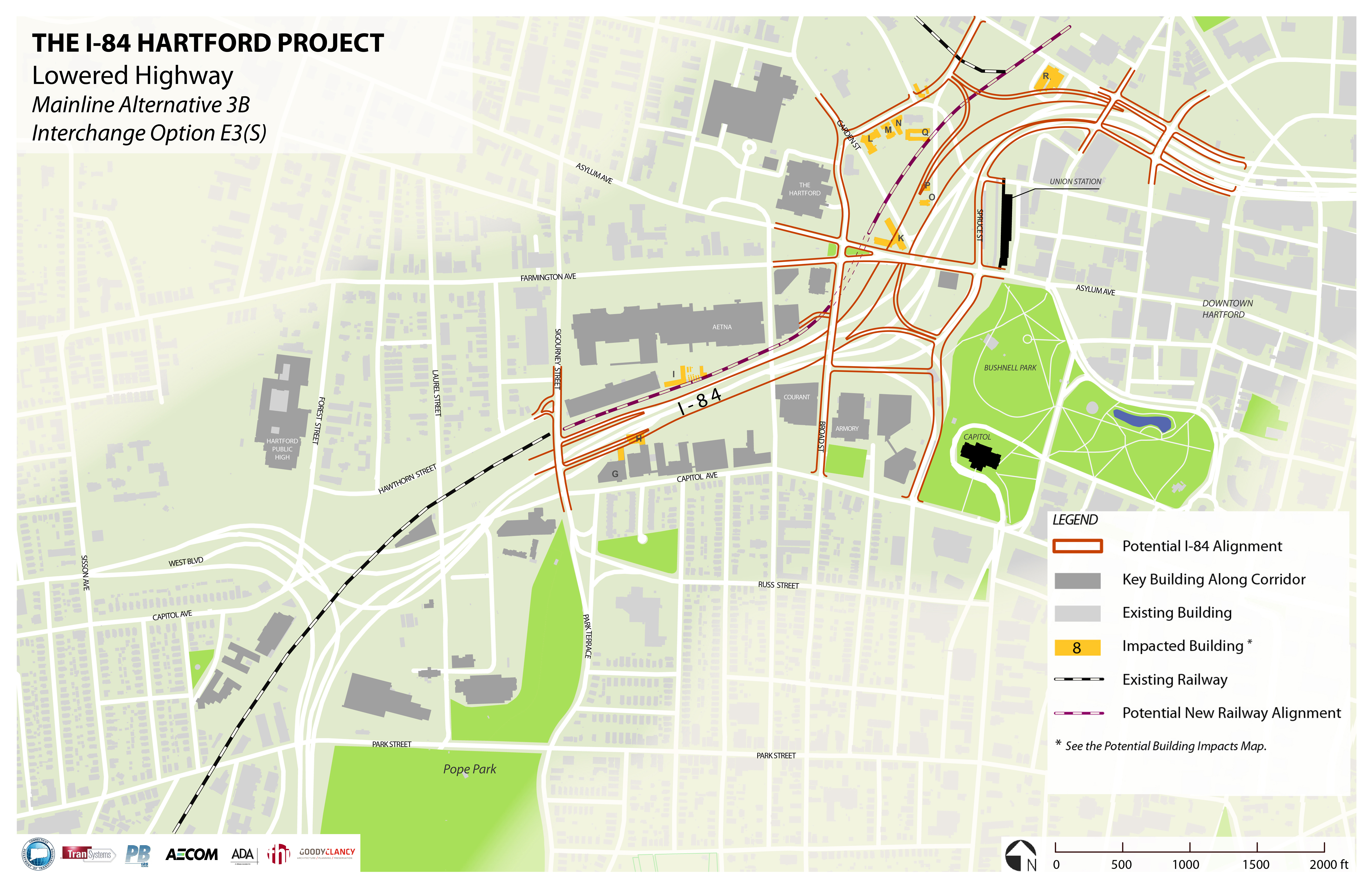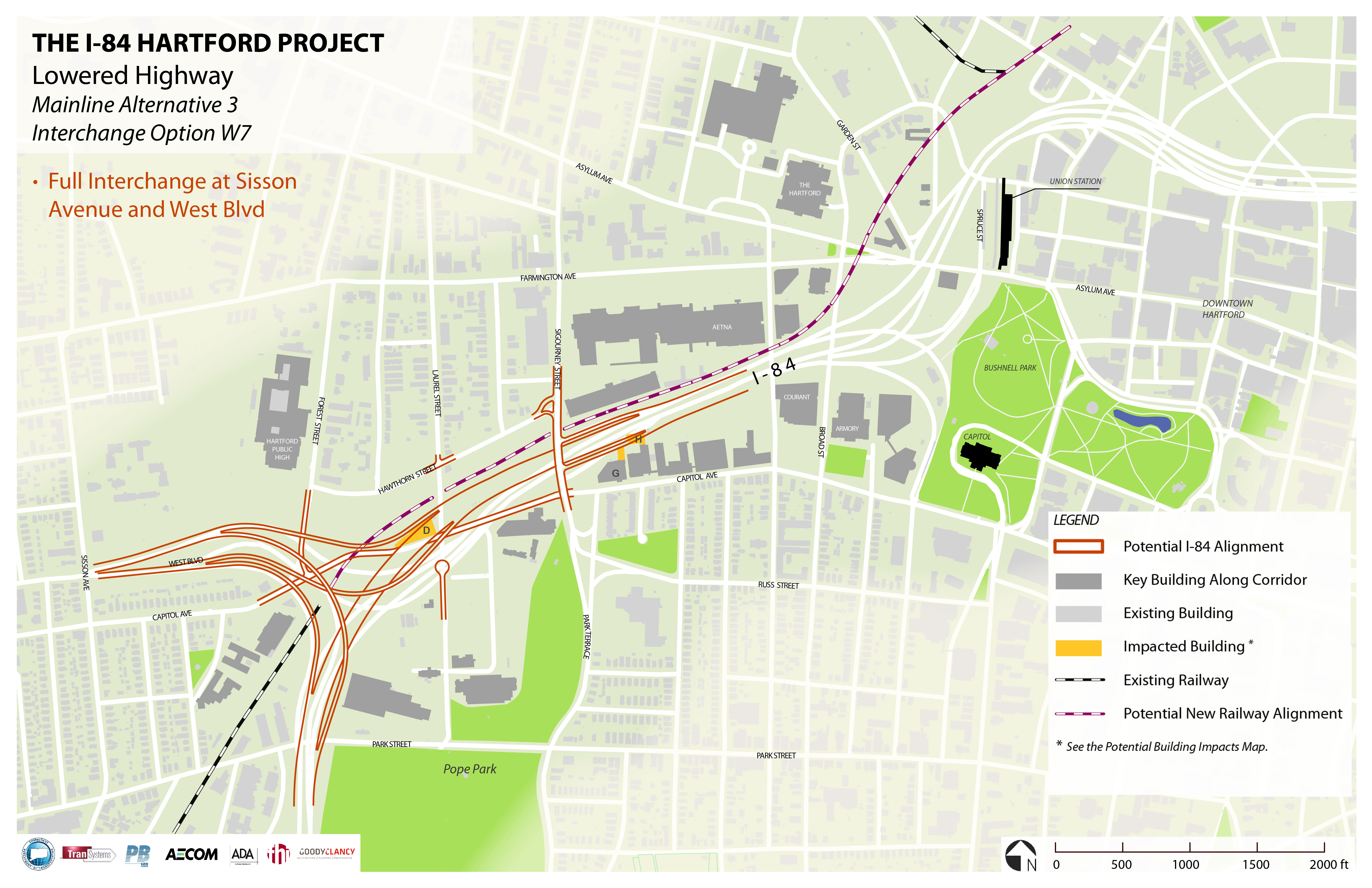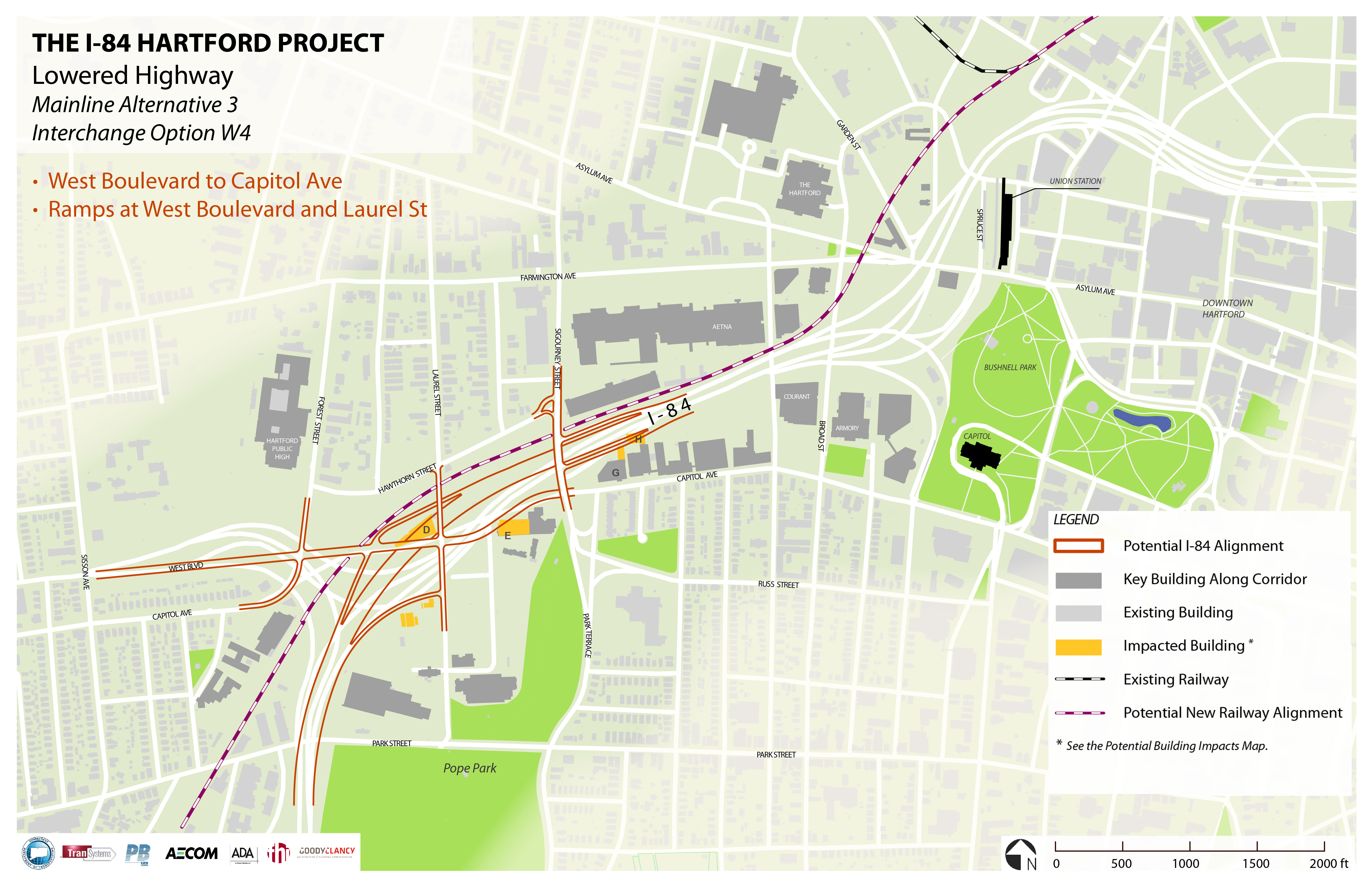 This interchange option routes eastbound on- and off-ramps to a new road connecting Asylum Street and Capitol Avenue, and westbound on- and off-ramps to Edwards Street. The Sigourney Street eastbound on-ramp and westbound off-ramp are rebuilt.