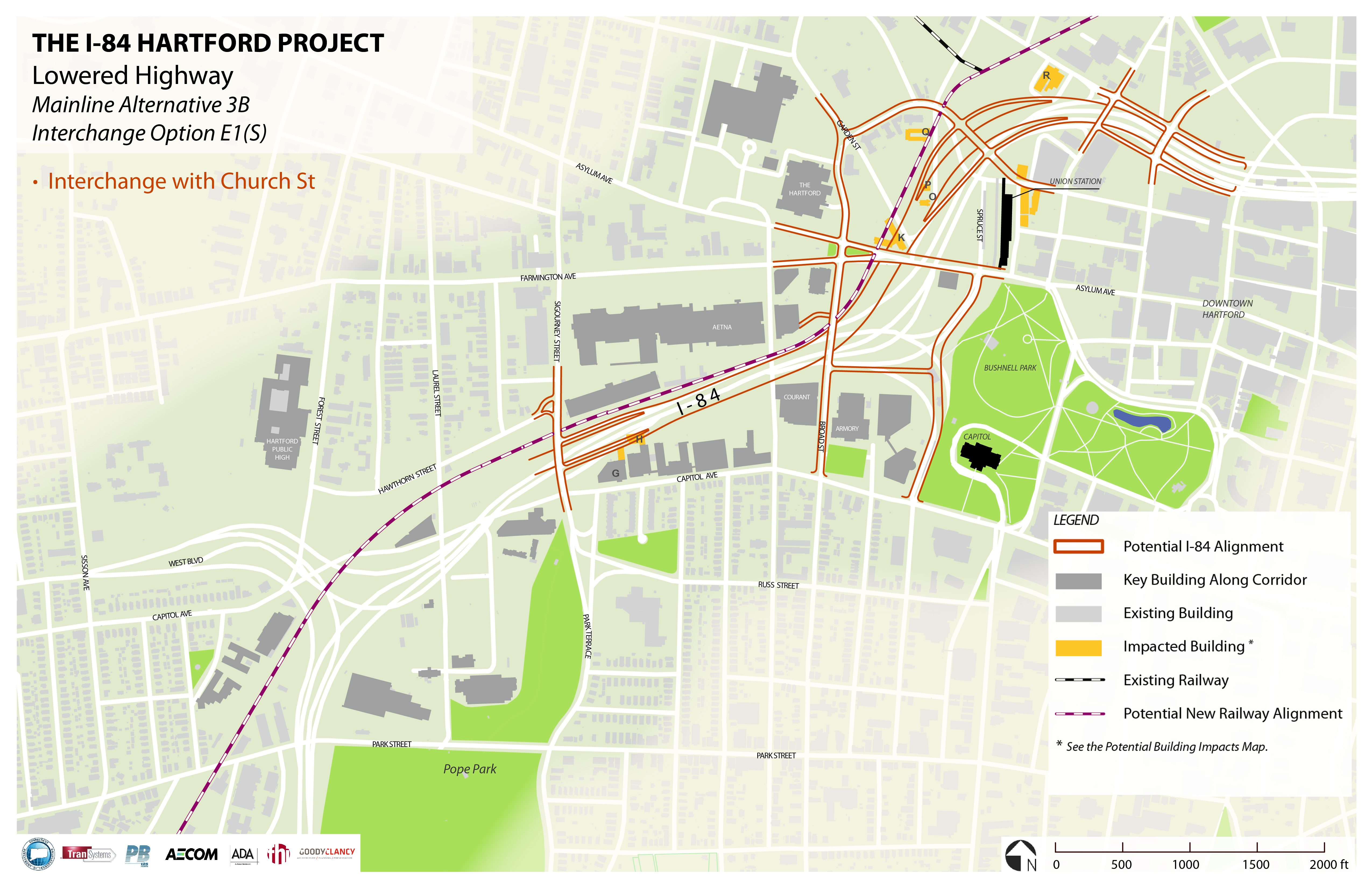 This interchange option routes east and westbound on- and off-ramps to a realigned Myrtle Street-to-Church Street connector road. The Sigourney Street eastbound on-ramp and westbound off-ramp are rebuilt.