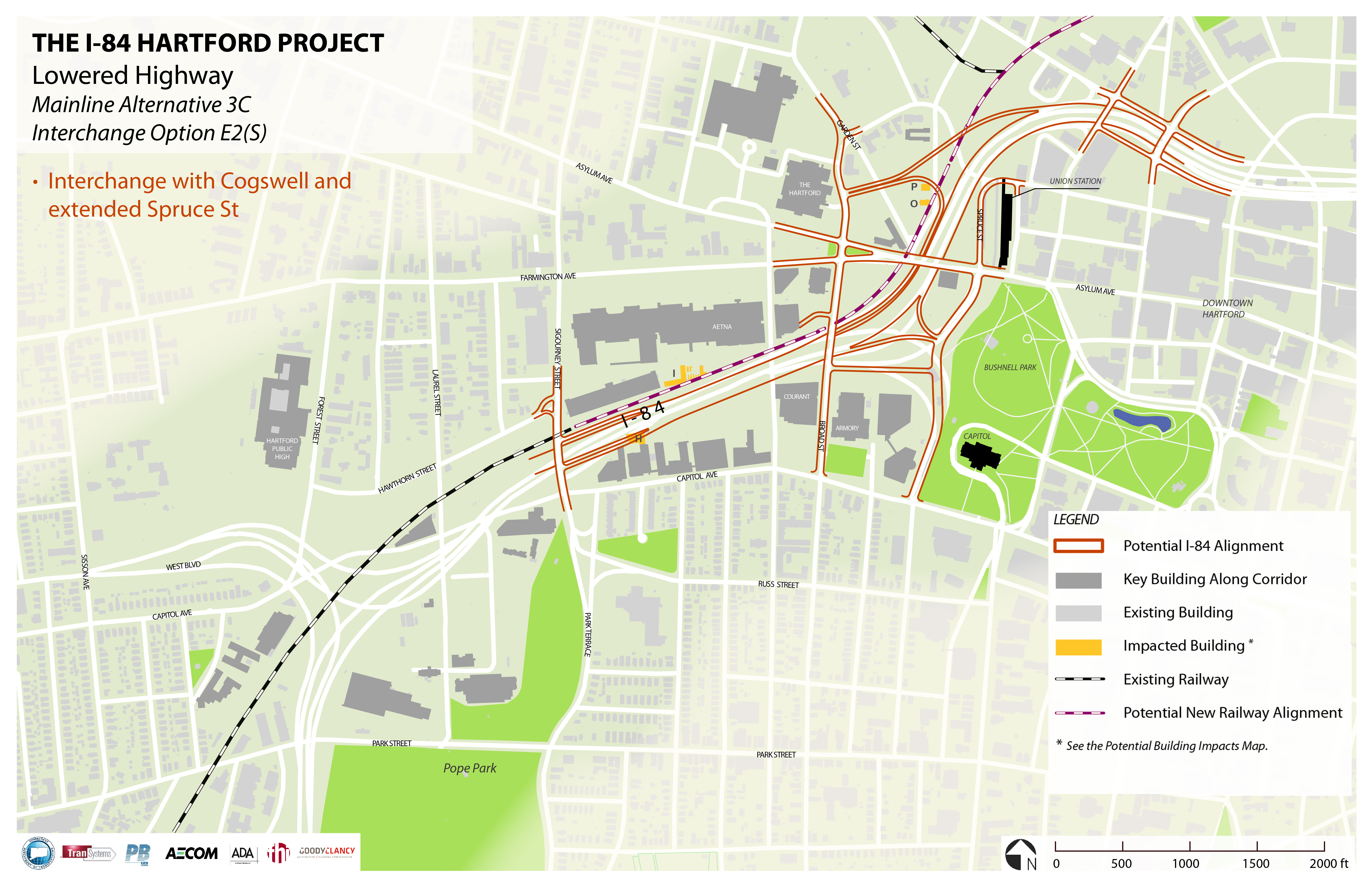This interchange option routes eastbound on- and off-ramps to a new road connecting Asylum Street and Capitol Avenue, and westbound on- and off-ramps to Cogswell Street. The Sigourney Street eastbound on-ramp and westbound off-ramp are rebuilt.
